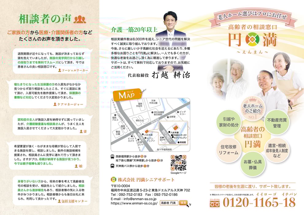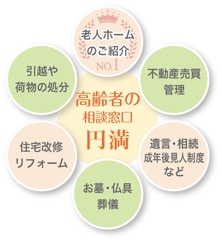 上記内容以外のご相談にも柔軟に対応できるように、高齢者の相談窓口『 円満 』では、高齢者の方々の様々なお悩み事をご相談を承っております。